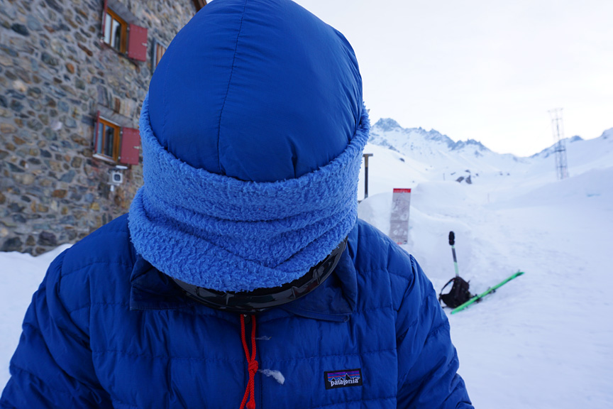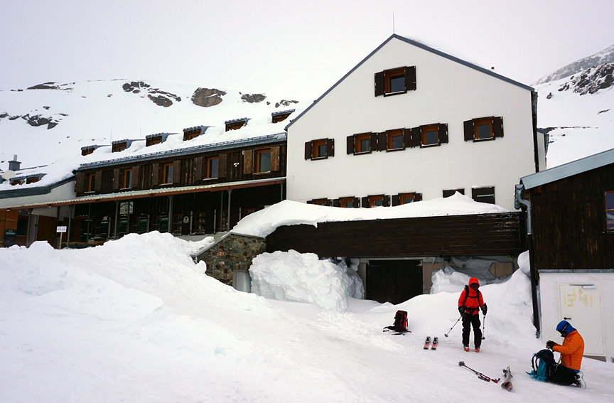 Our last day, the temperatures moderated a great deal. Saying goodbye to the Wiesbadener hut, we bail down the valley in poor visibility and a strong tail wind. |