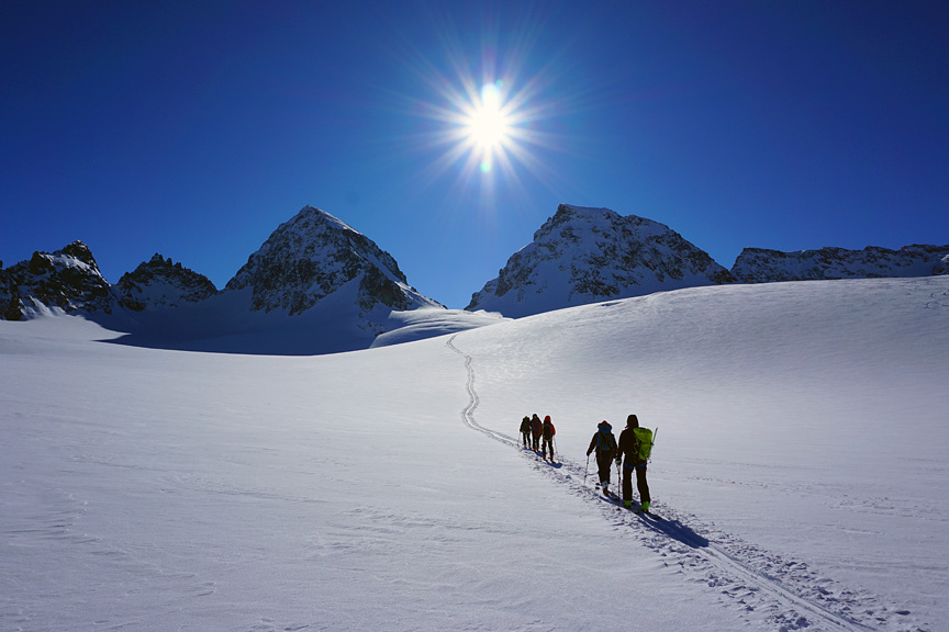 Higher on the glacier, our goal slowly draws closer. Piz Buin is the peak to the left of the sun here. |