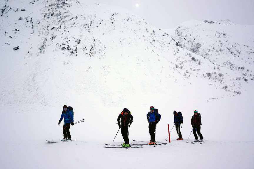 On day two, we headed up under a low ceiling of fog toward the Gamsspitze. |
