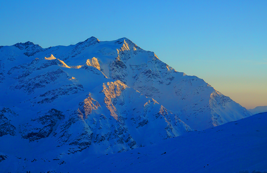 Sunrise as we hop onto the Cevedale glacier. |