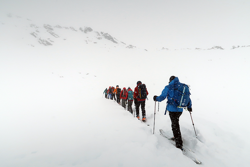 Day 1: heavy fog and snow as we start out from the ski area at Sulden. |