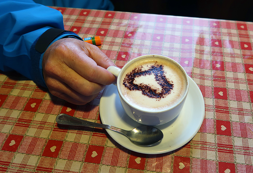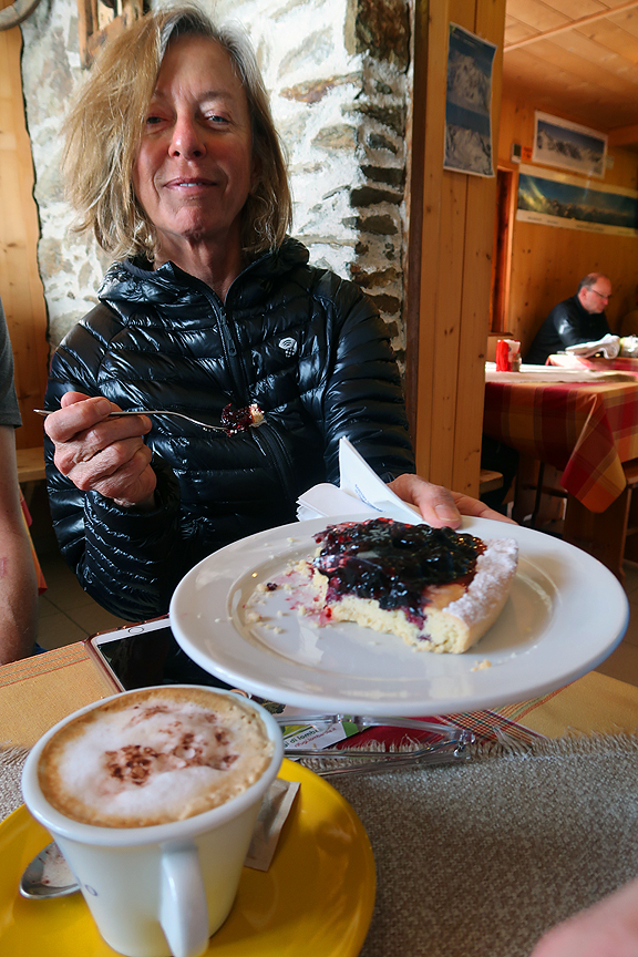 Safely back in the hut, Patsy rewards herself with some very photo-worthy blueberry pie and capuccino! |