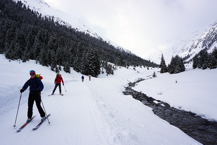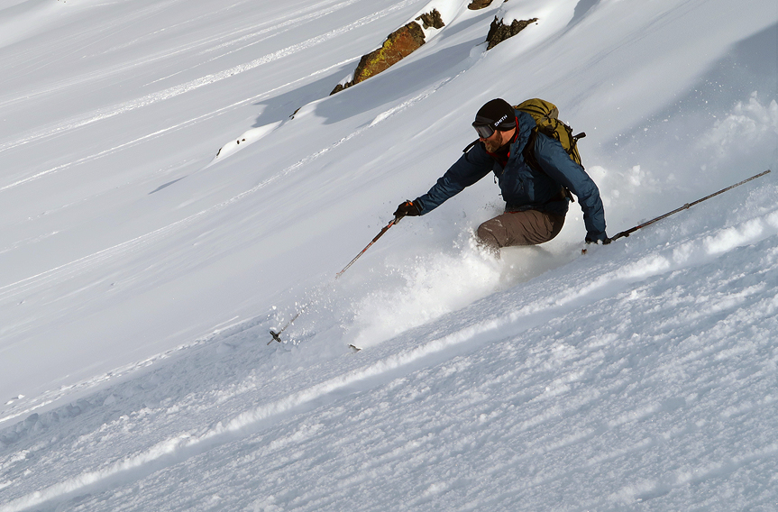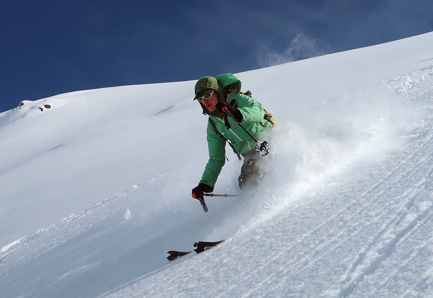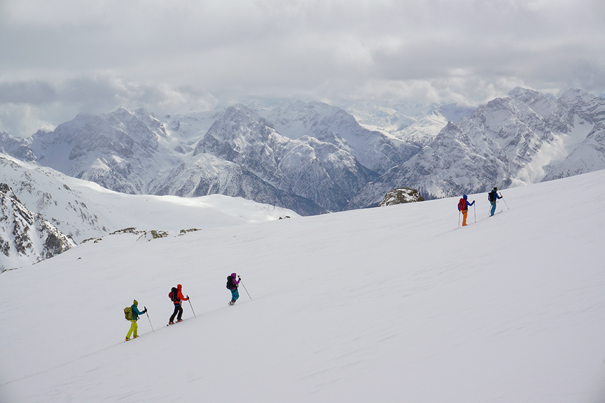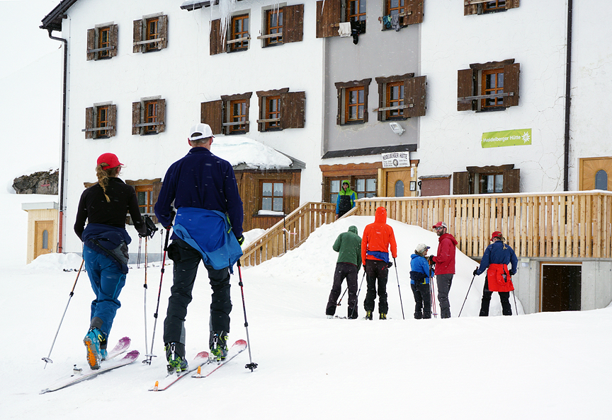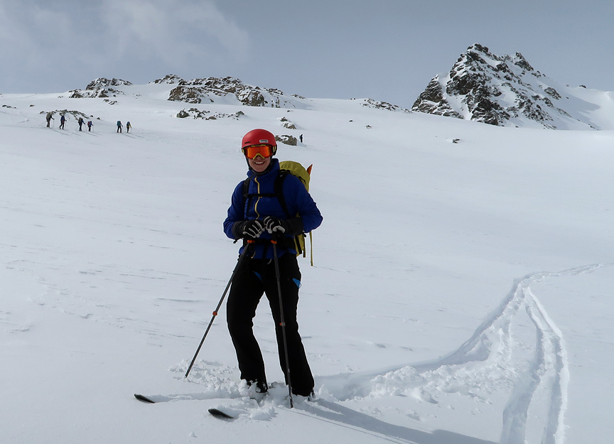 We head up toward the Hintere Jamspitze, but caution about wind-loaded slopes keep us from summiting. We enjoy the sheltered slopes lower down. |