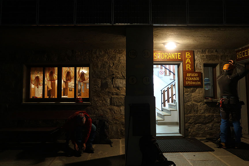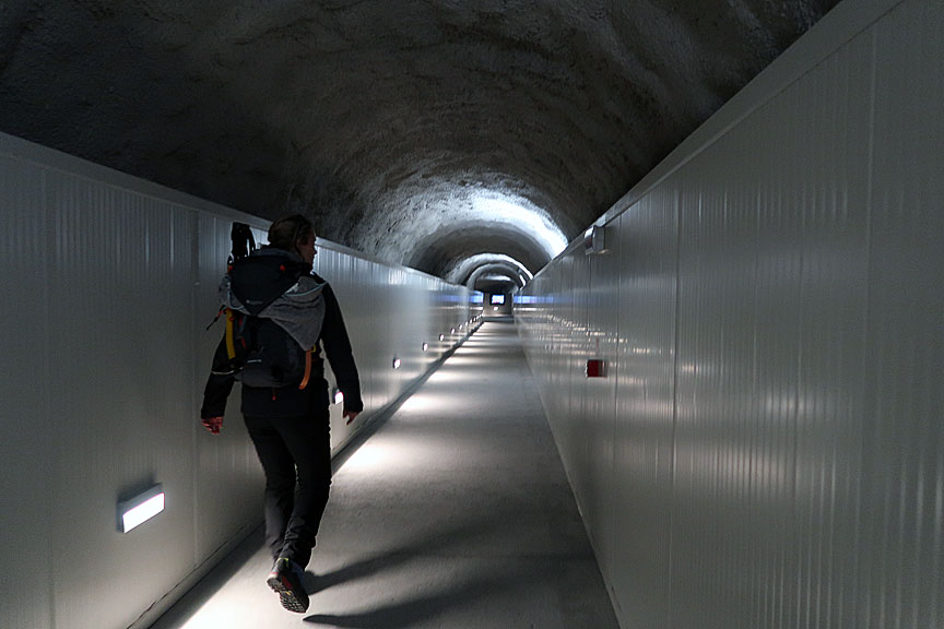 The day started with a bit of trains, planes and automobiles. In actuality, a drive through the Mont Blanc tunnel to Italy, a téléphérique ride up to Point Helbronner, an elevator and this James Bond-ian tunnel to the Torino hut. |