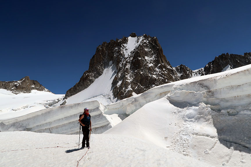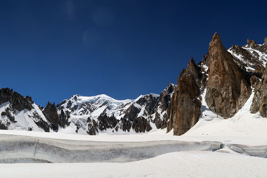 Next order of business, a wander about the glacier to get a close-up view of some of its "features" (i.e. crevasses), and enjoy the more far-off view of Mont Blanc. |