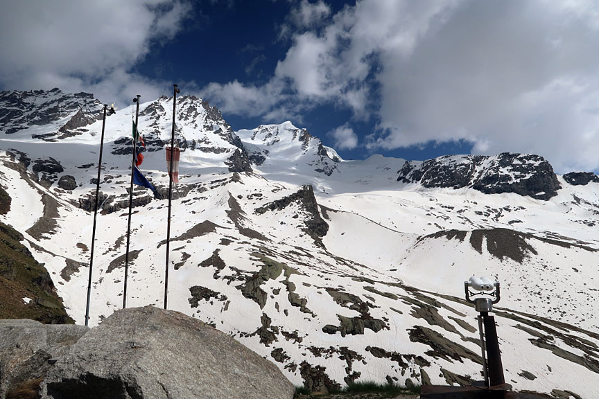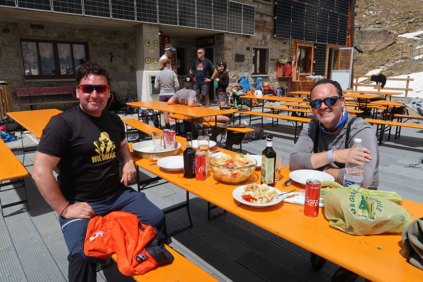 Early the following morning we did a bit more practice before heading onward to the Gran Paradiso National Park. Here we pause to take in the sunshine before heading back to the top station of the "Skyway" cable car (in background). |