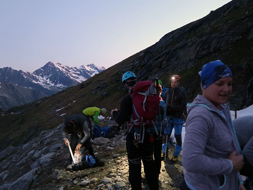 All too soon it's "oh-dark-thirty" and time to get the ball rolling. Suiting up outside the hut. |