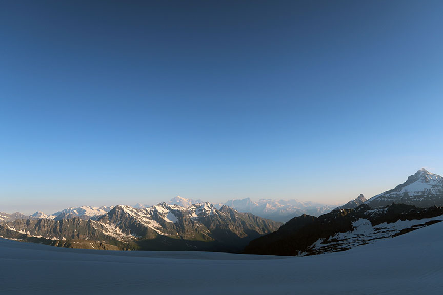 Our first order of business was to get acquainted with the use of crampons and travelling roped together on a glacier. We scampered to the top of the Petit Flambeau, for a picnic and a sneak preview of Gran Paradiso, in the far distance; our goal for the last day. |