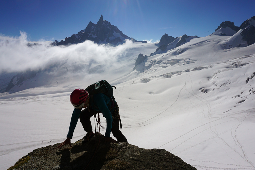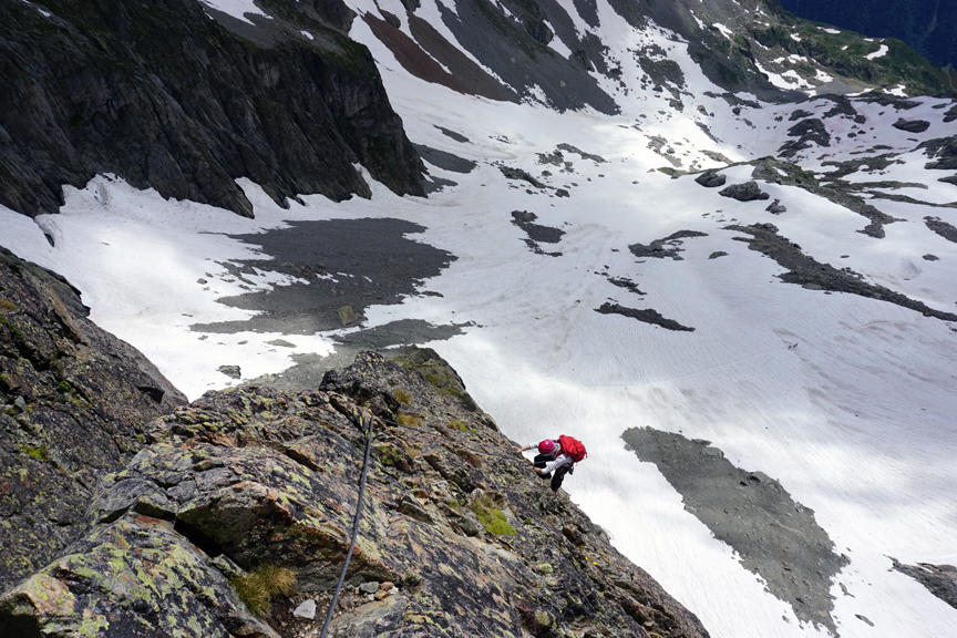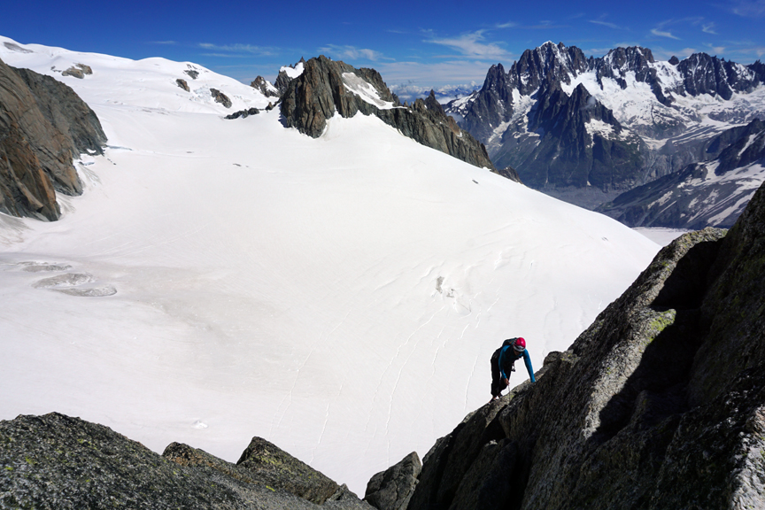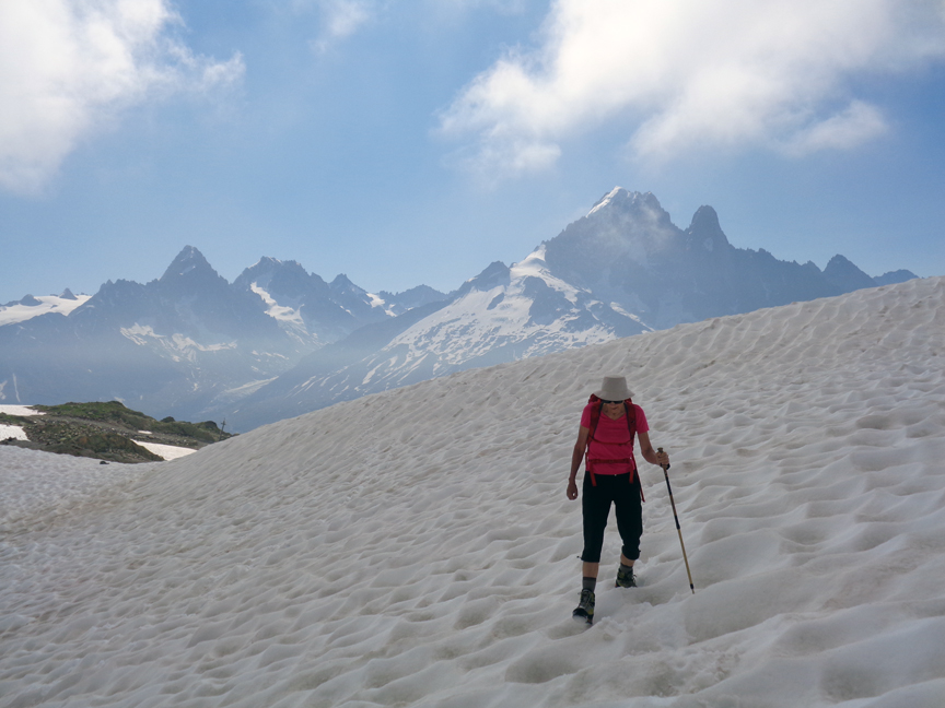 Looking for something shorter the following day, we crossed the snows of the Flegere to Fraise des Boâtsch, on the Aiguille de la Floria. |