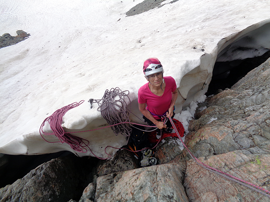 Gini at one of the belays of Le Nain Jaune Attend (The Yellow Dwarf Awaits). |