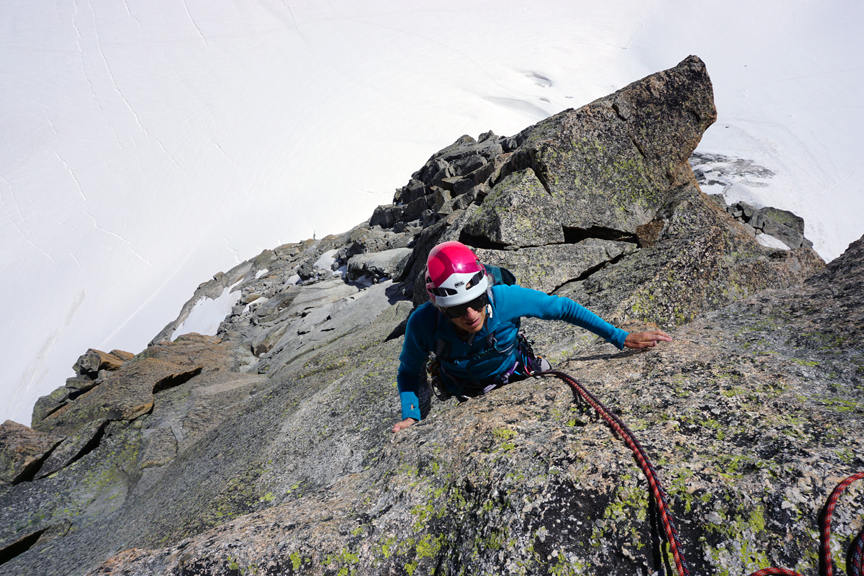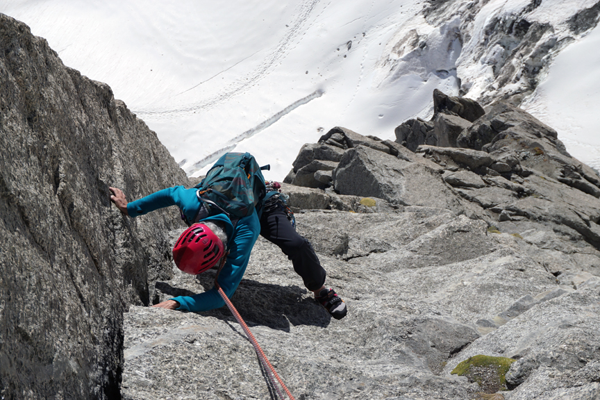 Some 6 pitches later Gini tops out of the crux 5b (or maybe 5c) pitch. |