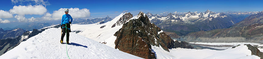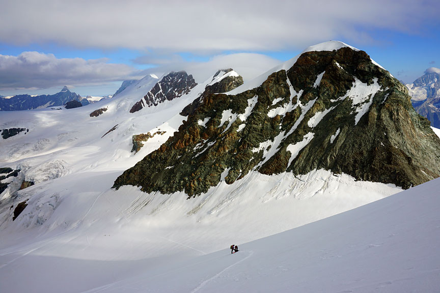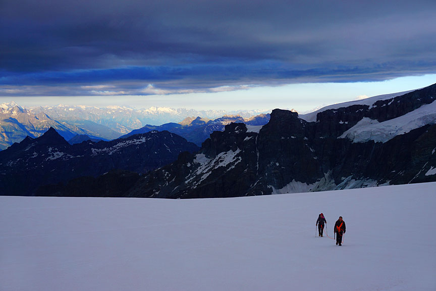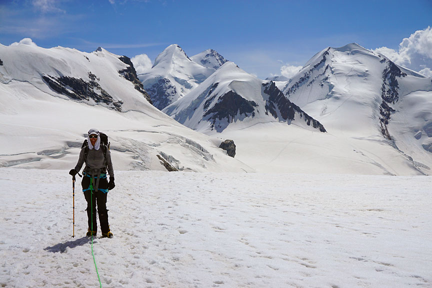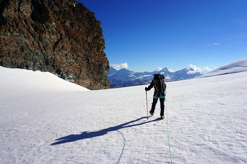 On the slopes of Castor. Pollux is the first peak on the right, and the long ridge of the Breithorn, just left of center. |
