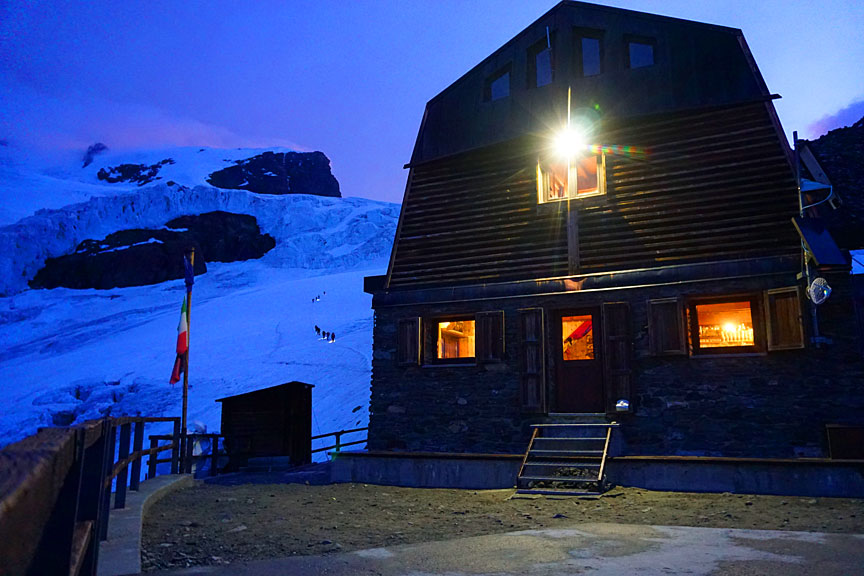 We arrived early to the Sella hut, our planned stopping spot for the night. After checking and rechecking the weather forecast, and calling a few huts, we decided that it was better to put ourselves in a position from which we could return to Zermatt the following day. So with this goal in mind, we descended to the Mezzalama hut for the night, adding some 5+ hours of hiking to our day. |