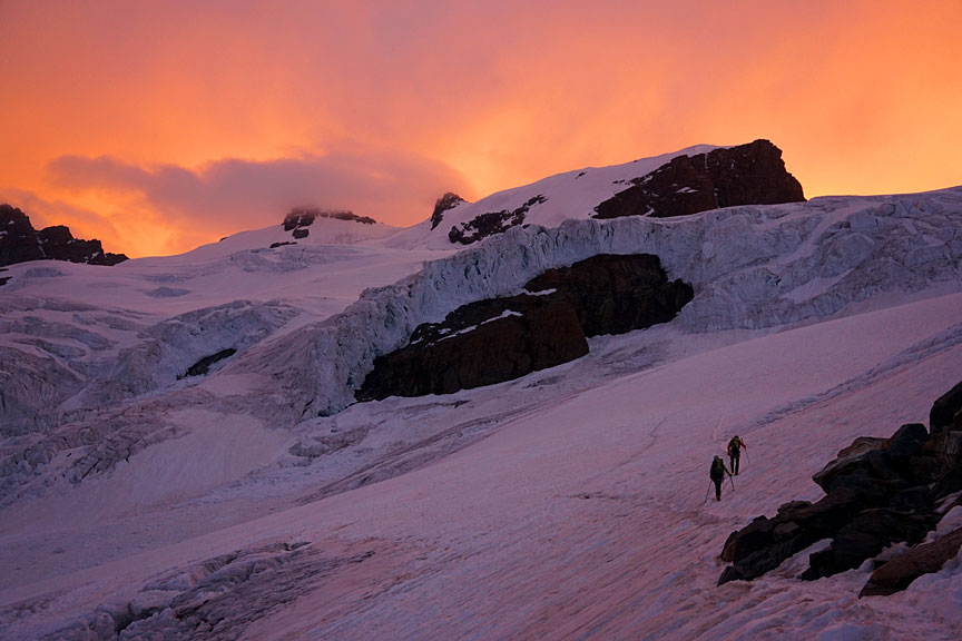 An ominous but beautiful sunrise greets us on Day Two. We start up towards the traverse of Castor. |