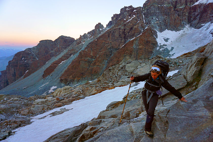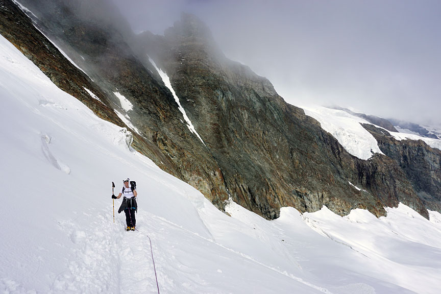 Climbing up the pass between the Allalinhorn and the Feechopf. |