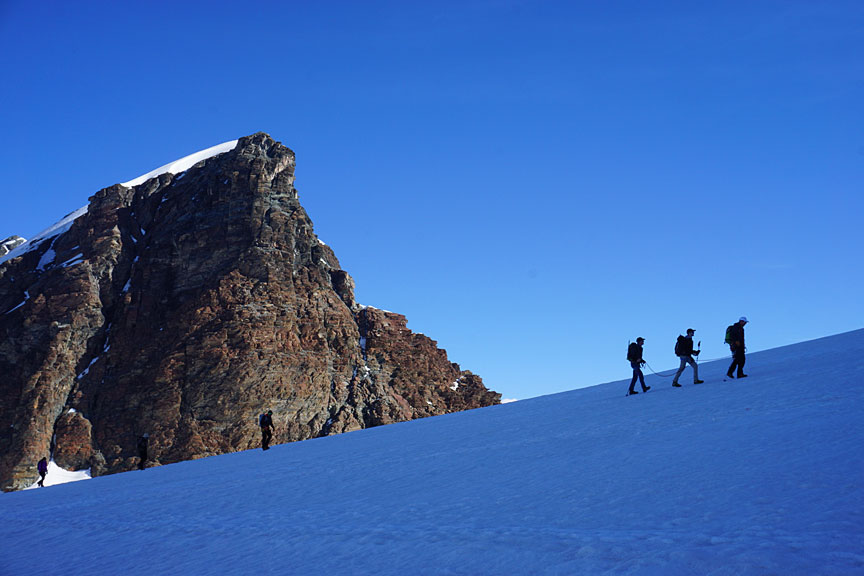 The following day, we scramble back up to the level of the Guide d'Ayas hut, then continue across the glacial plateau to the Klein Matterhorn, and our ride down to Zermatt. |