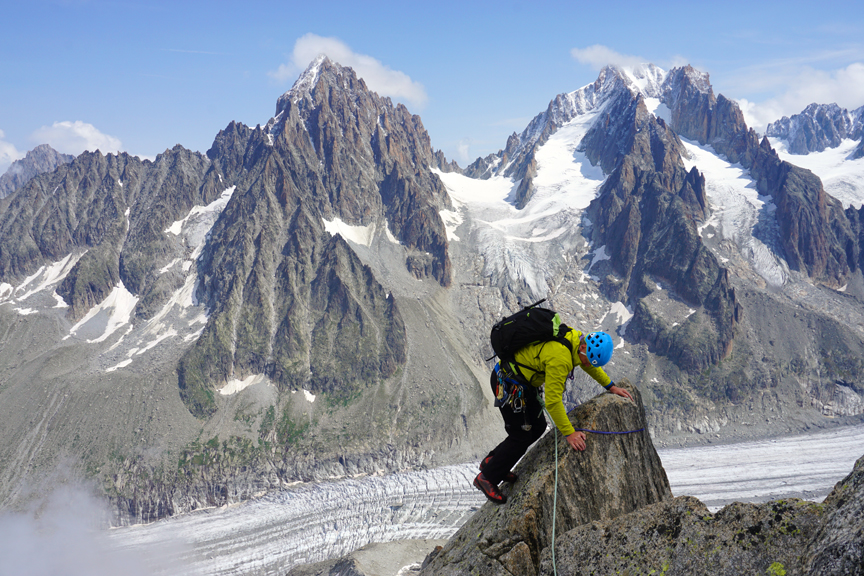 In order to make day 2 a hut hiking approach, we needed a one day climb. The Flegere and Aiguille du Midi lifts were both closed, so options were limited. But we did find an excellent adventure with the NE Ridge of the Grands Montets. |
