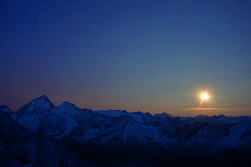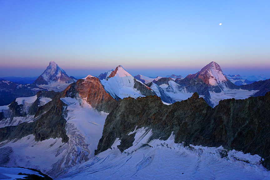 Breakfast at 4 am, and on up the Rothorn. The moon nears the horizon over the Dent Blanche as the sun just lights up the highest peaks. |