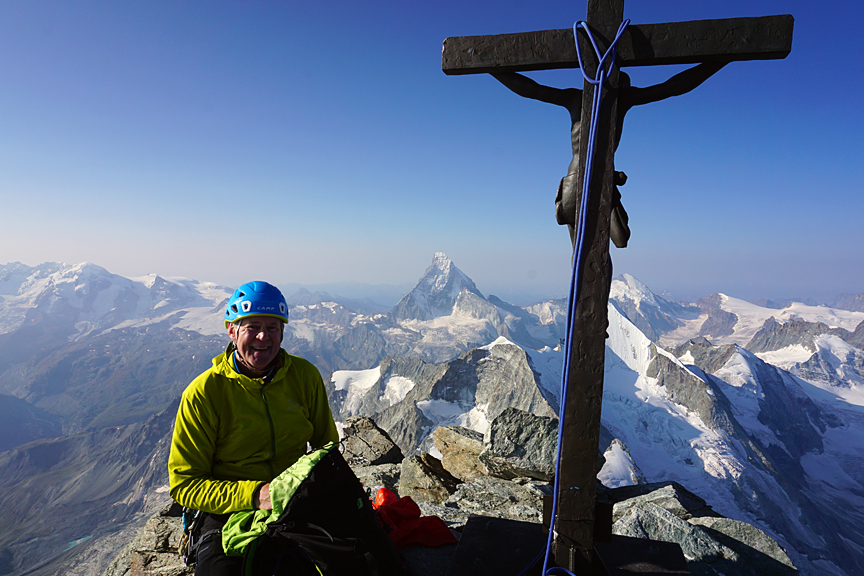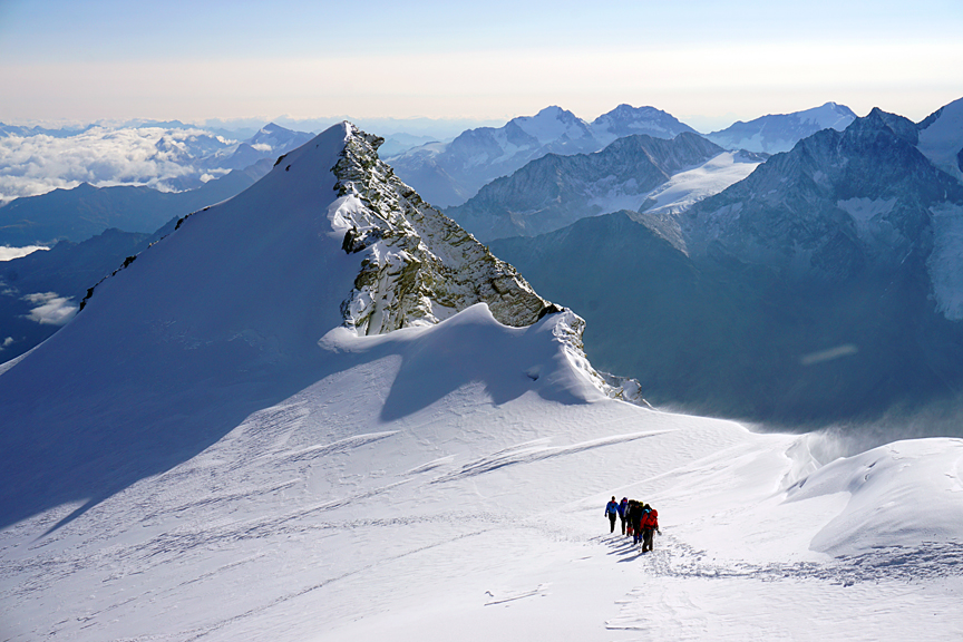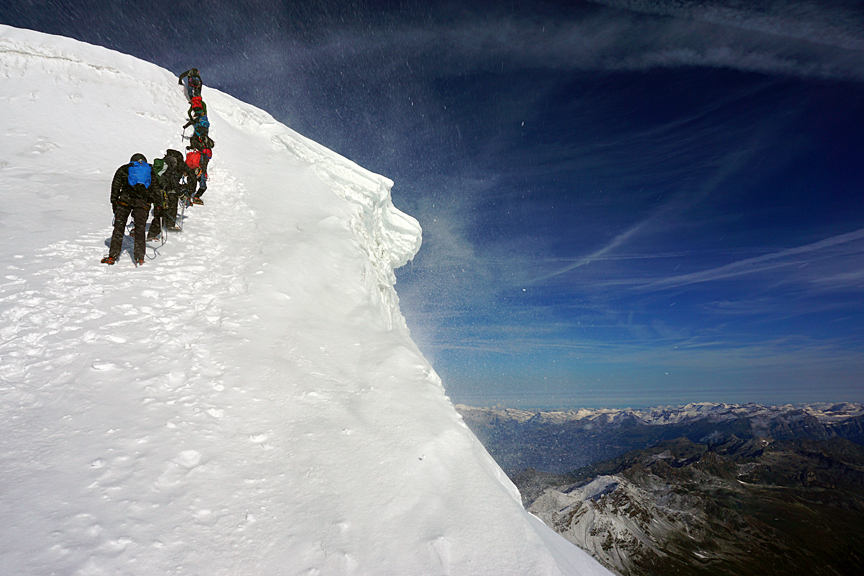 On the Bishorn summit. We did not stay long, as the wind was brutal, and the press of the mob behind us was palpable. |