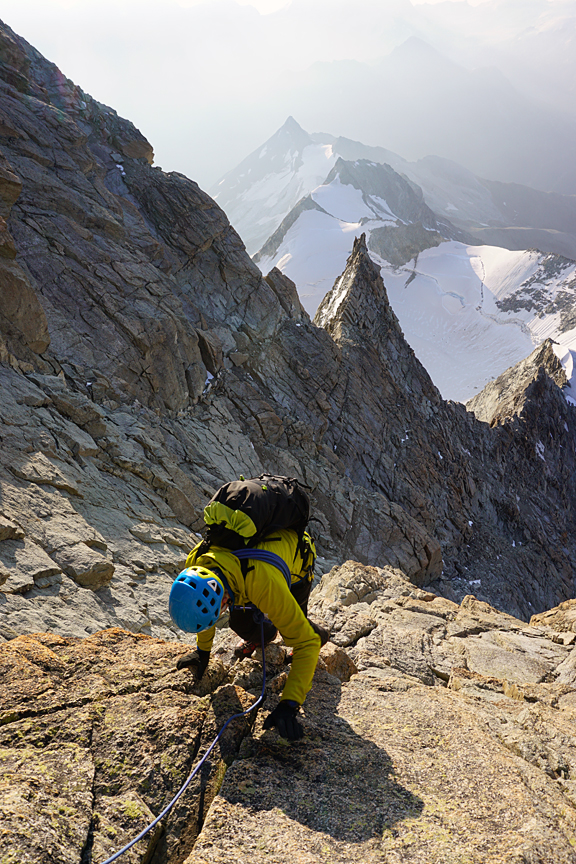 Grant climbs up over a tower on the descent. |