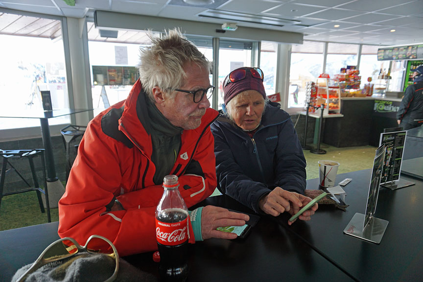 21st century technology! How we love it! Route previewing while awaiting the lift opening at La Flégère. |