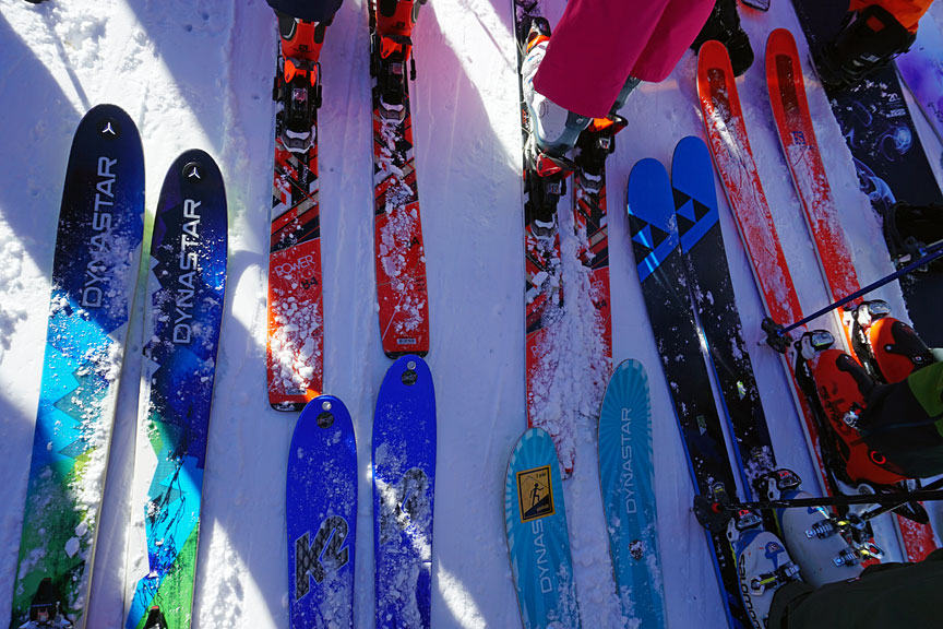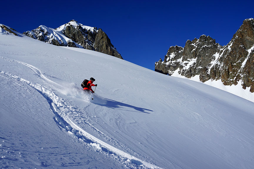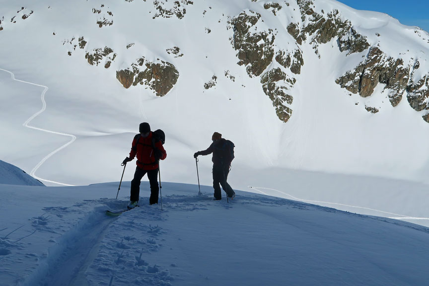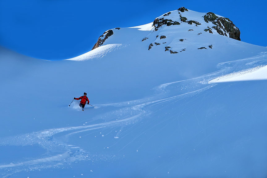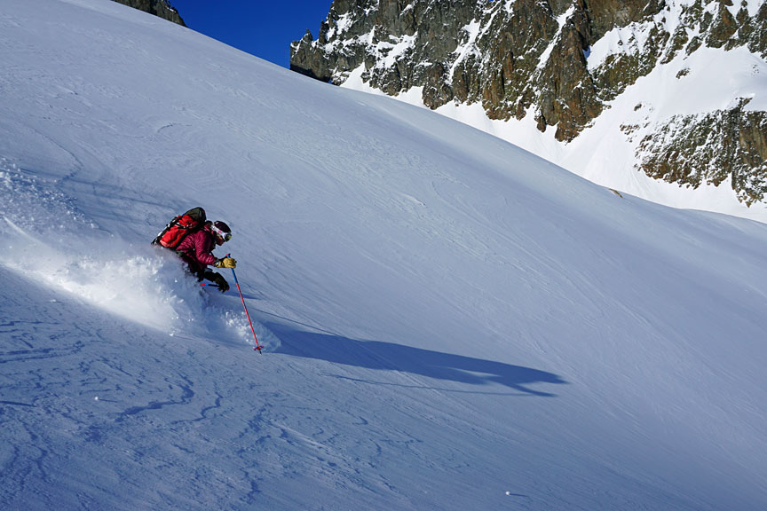 Sticking to wind-sheltered slopes, and avoiding the busier bowl nearby the snow was pretty darn good on the descent! |
