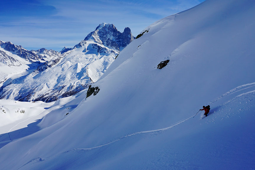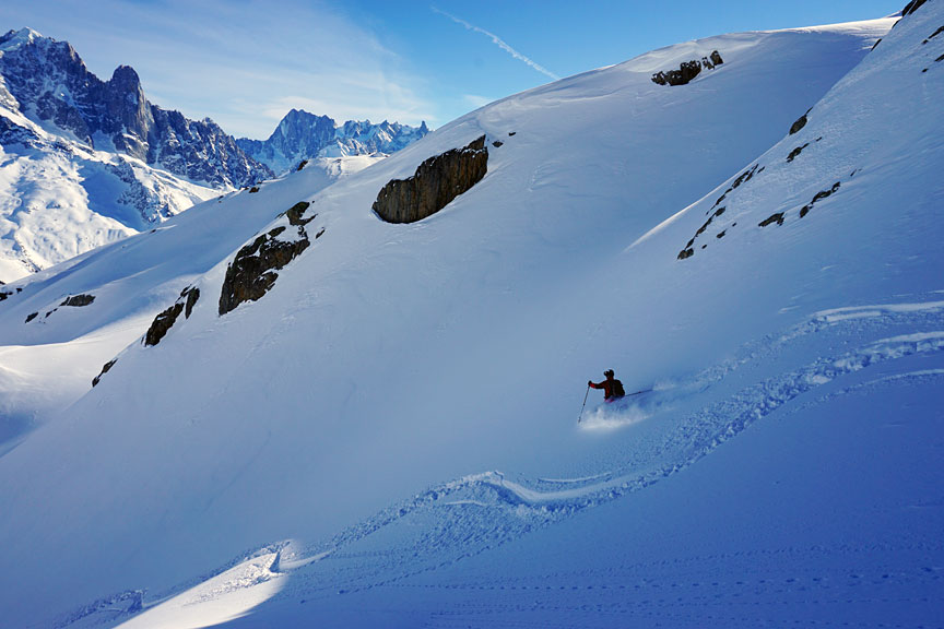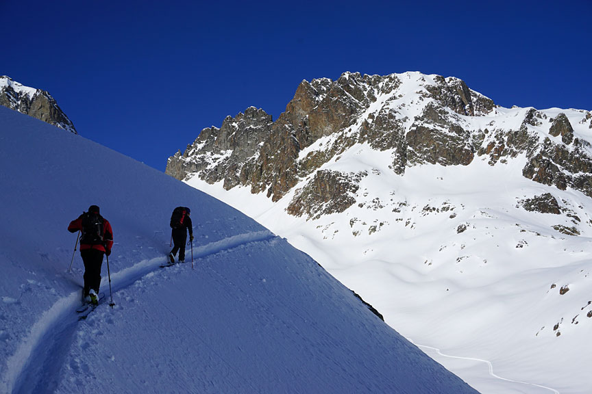 A stiff and bitter NE wind deterred us from our plan A, a tour behind the ridge of the Aiguilles Rouges. Instead we chose a more conservative option of touring up above Lac Blanc. |