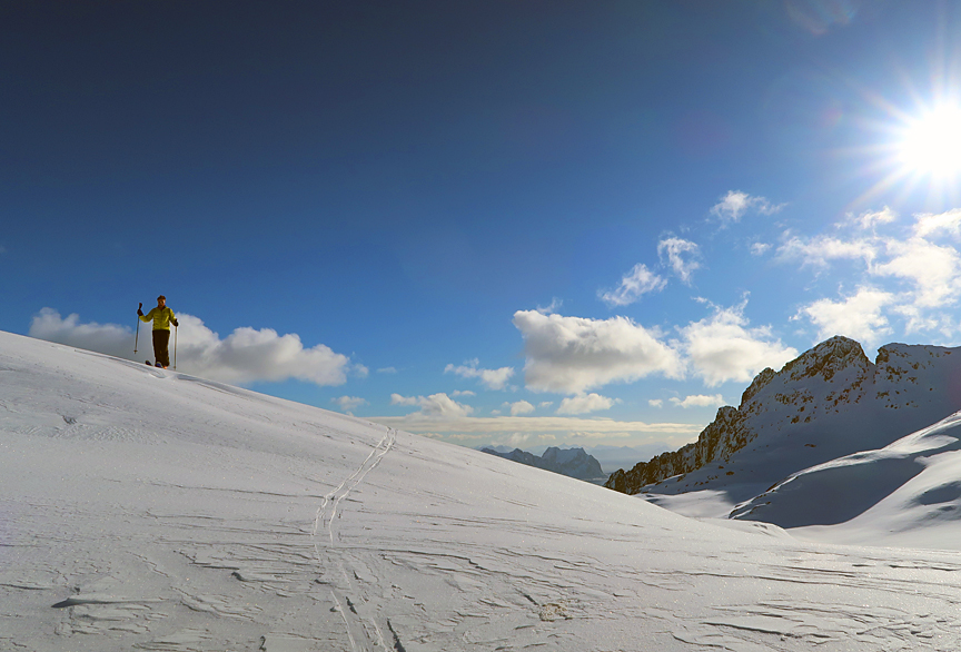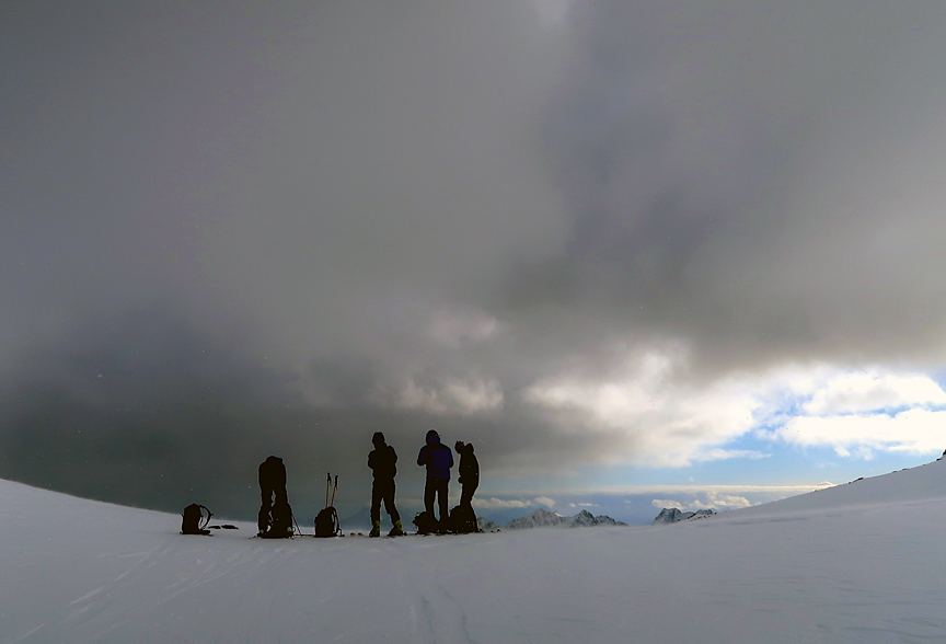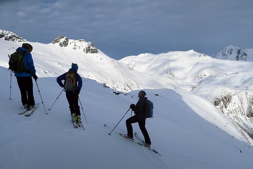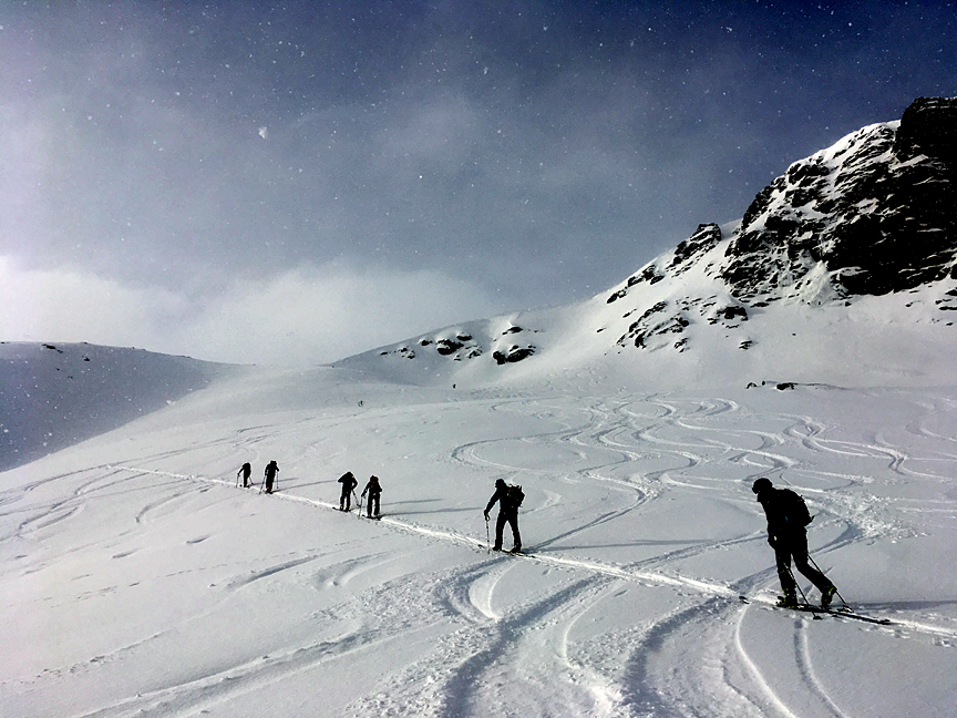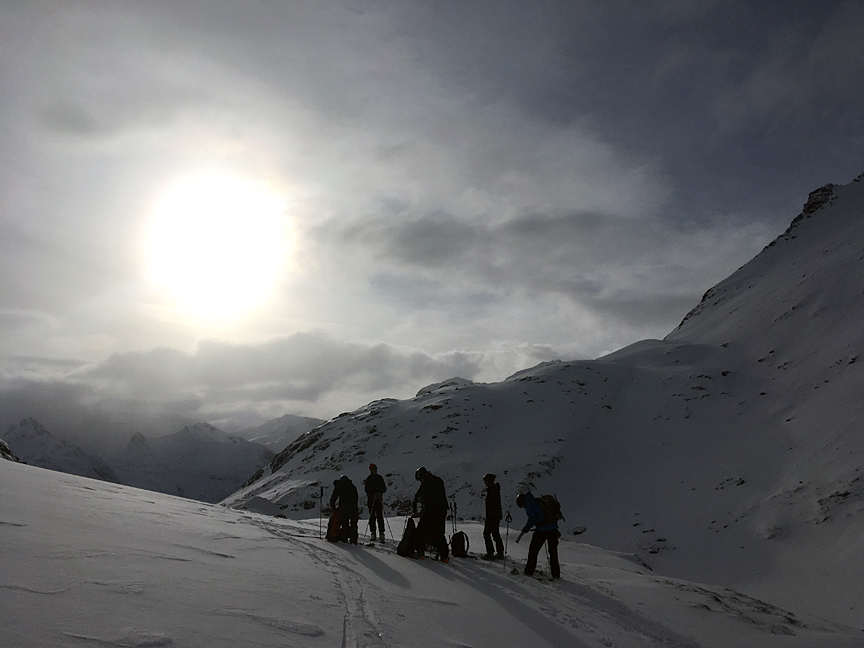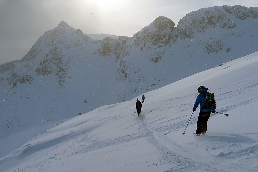 The slope we had hoped to ski ended up showing signs of instability, so we called it a touring day and headed back. |