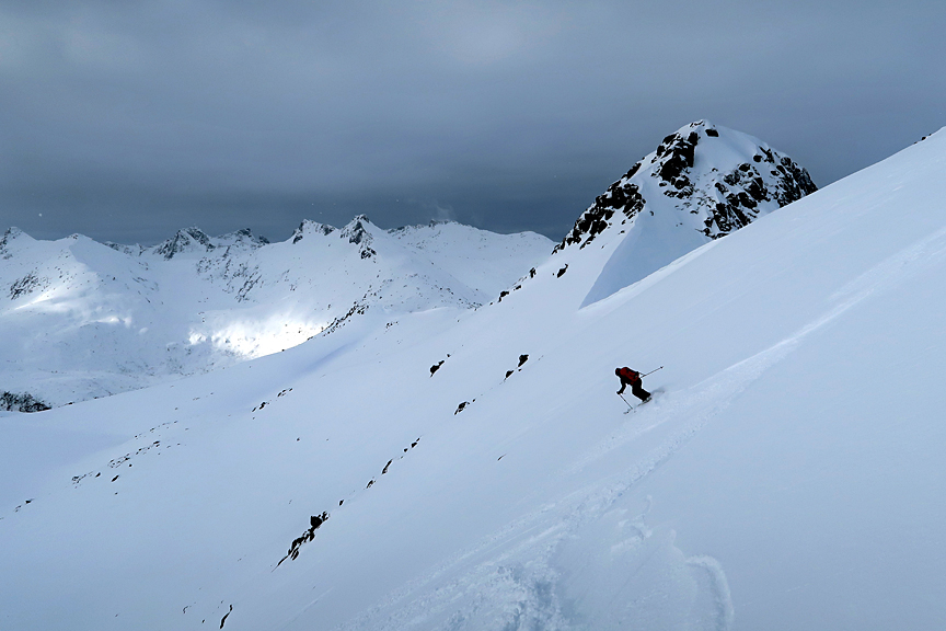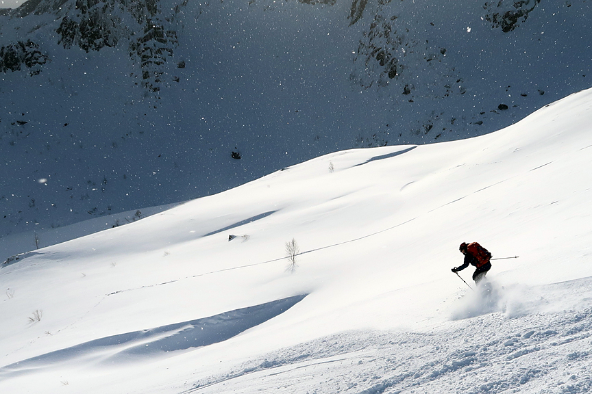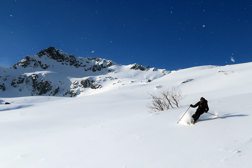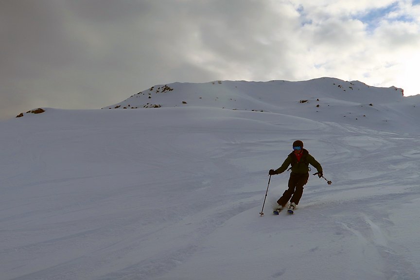 The run homeward yielded very good snow, and a lucky moment of good visibility. |