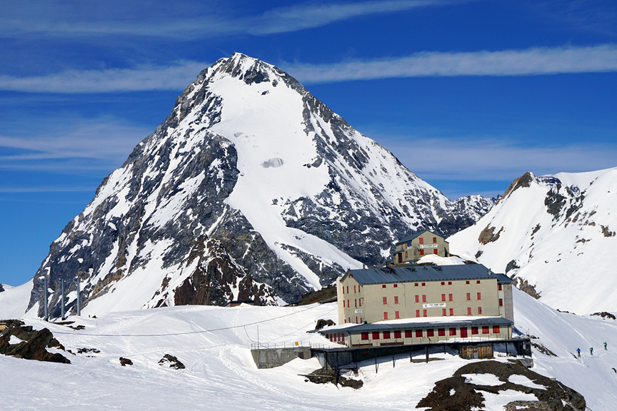 For our traverse to the Branca hut. We passed by the now-closed Cassati hut. Great view of the Gran Zebru looming behind. |