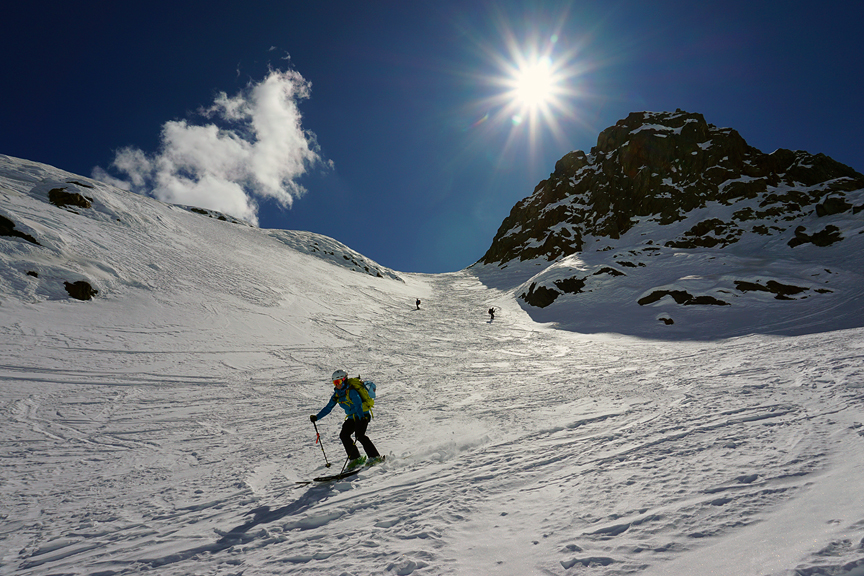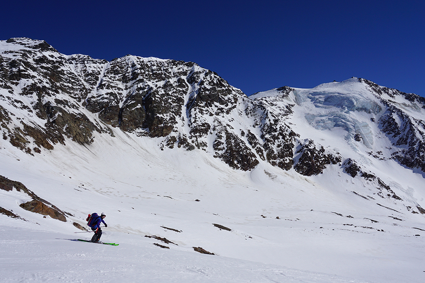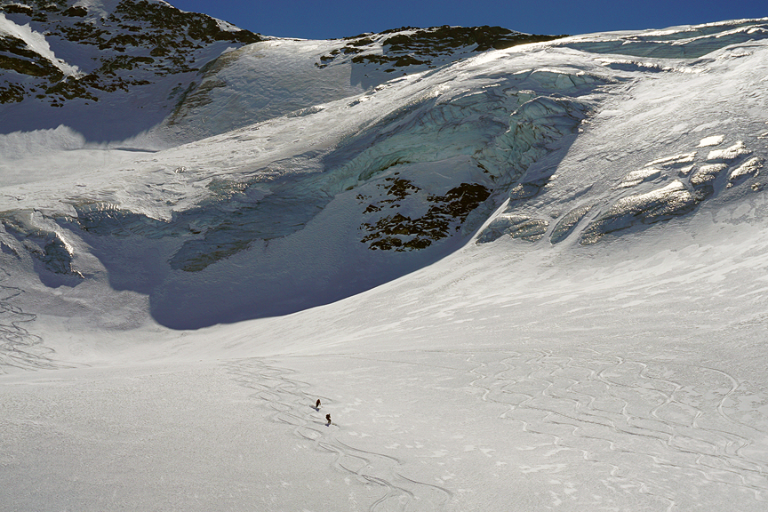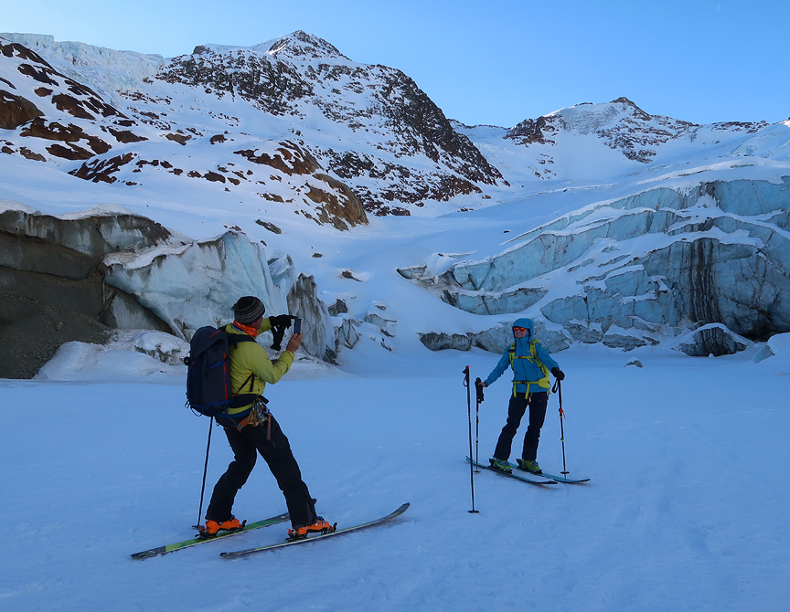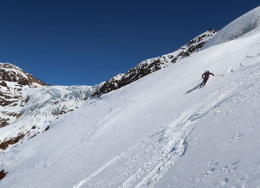 Conditions were extraordinarily firm and frozen on all but the most due-north aspects, so we opted to bypass the steep exposed glacier skiing of the upper Cedec glacier, and accessed its lower reaches instead by tromping down the steep track near the Cassati hut instead. Perfect snow for cramponning, if not for skiing! |