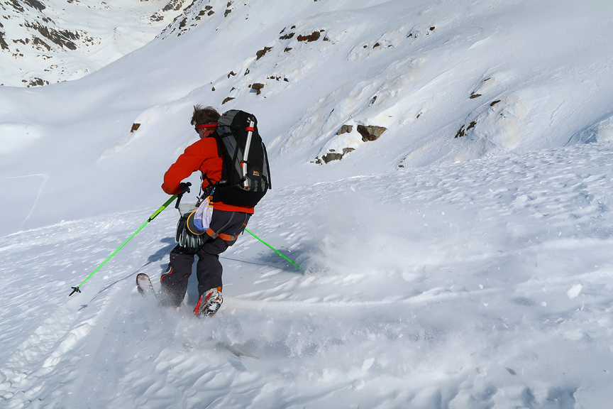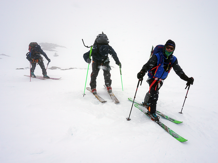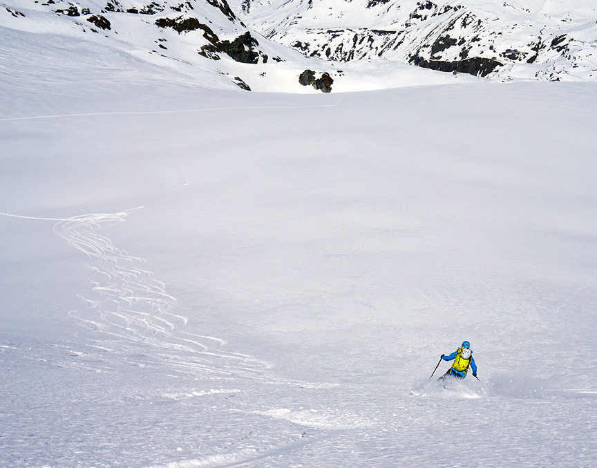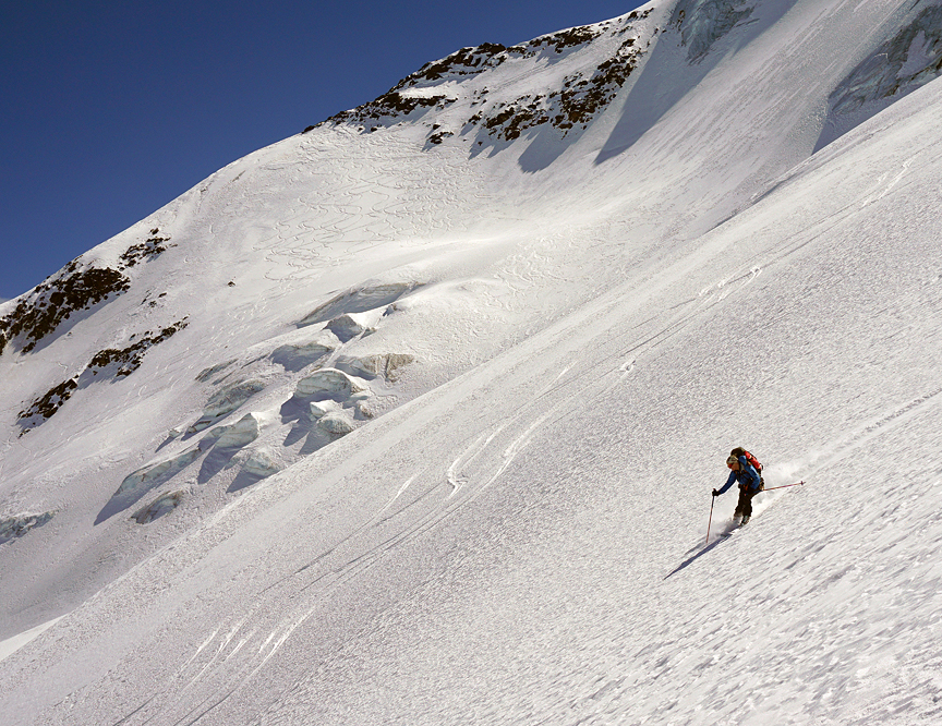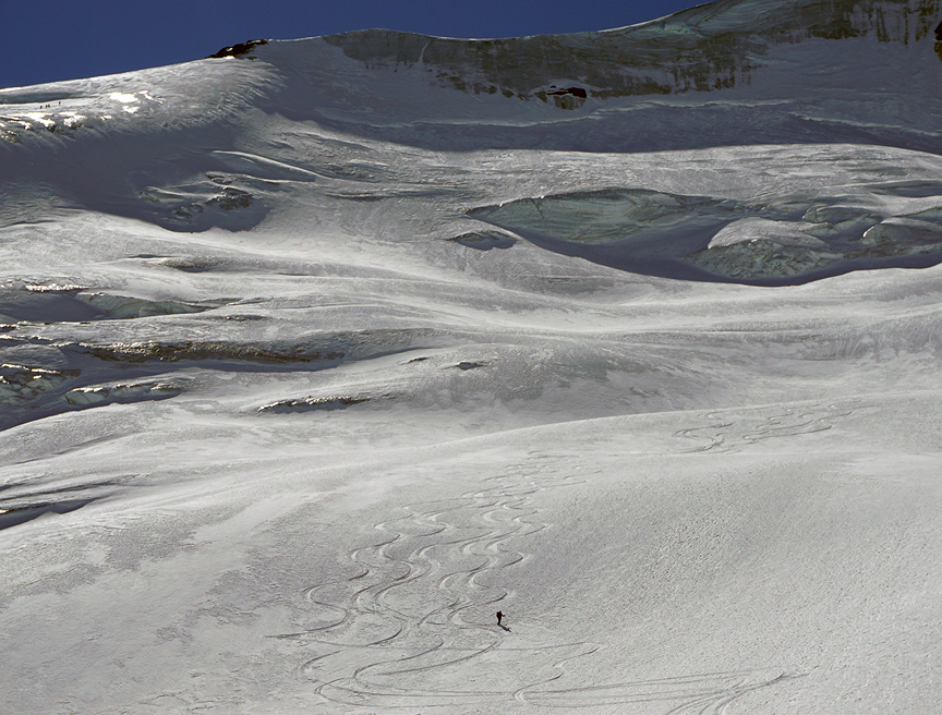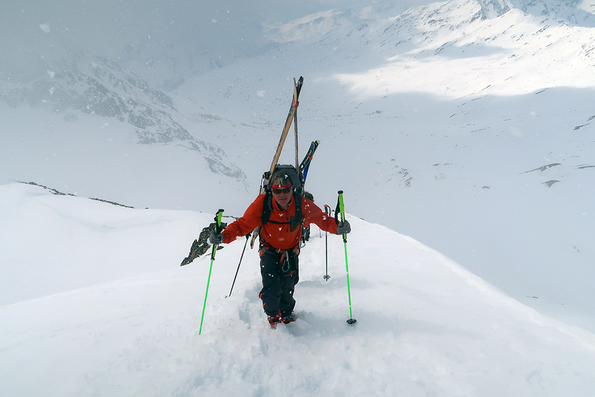 The next day we headed out again, with no summit at all in mind, just a theory about where we might find some good snow. |