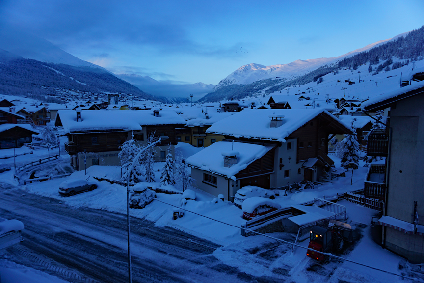 The day before the start of our trip snowed and snowed. Perfect! Though the avalanche hazard briefly spiked up to level 4 (out of 5) the new snow did wonders to cover the firmness developed over the previous weeks of dry weather. The view from our fine room in the Hotel St. Michael, Livigno. Damiano was a wonderful host. |