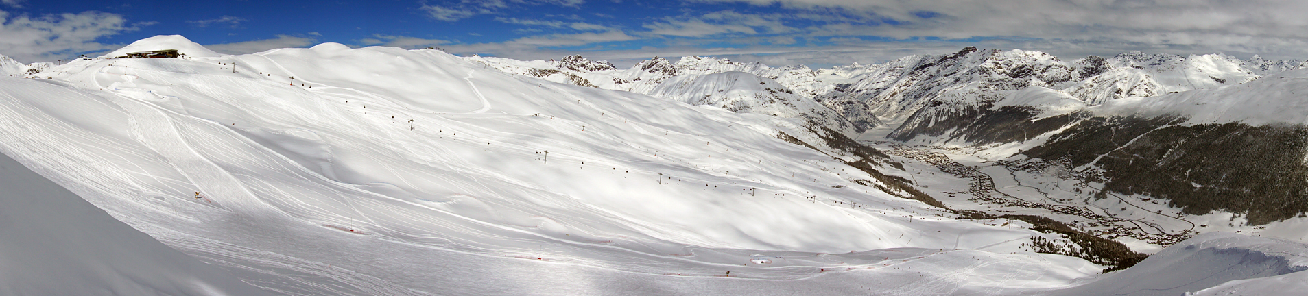 Part of the Livigno ski area. Use the scroll bar to see the whole image. We are looking north (mostly). Livigno lies in the valley below. |
