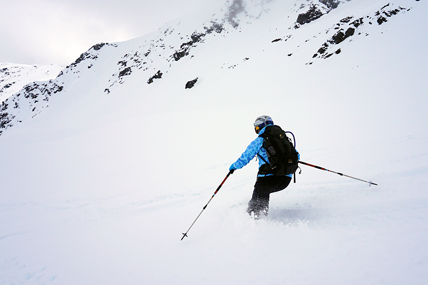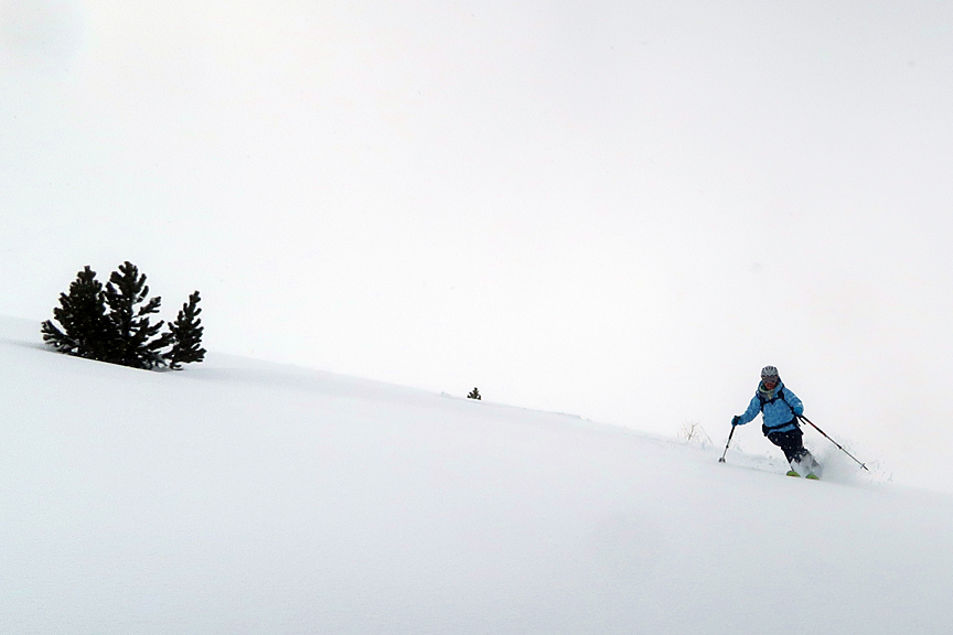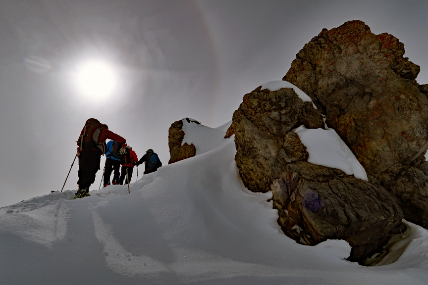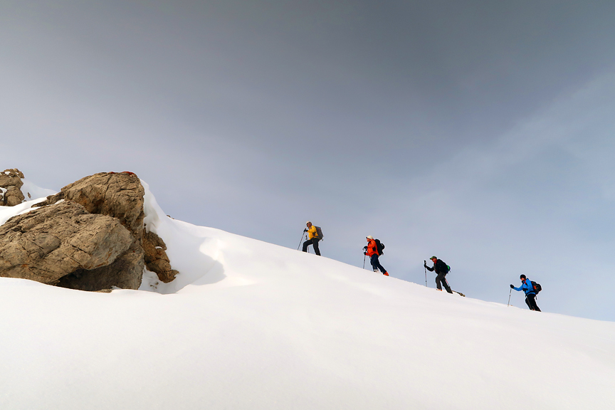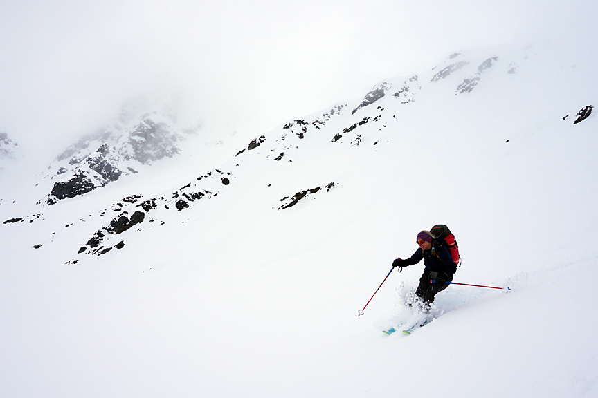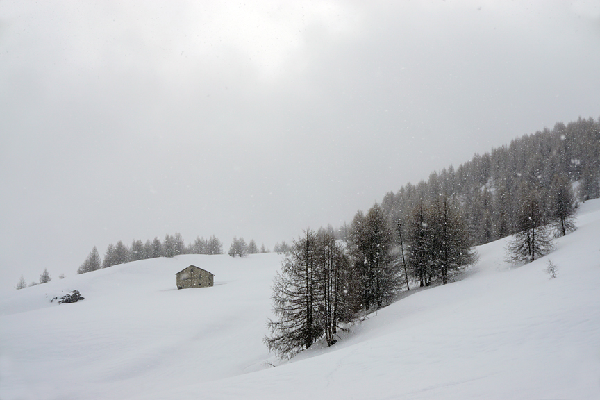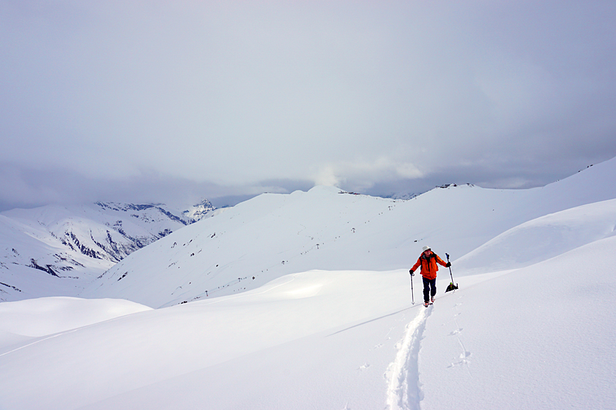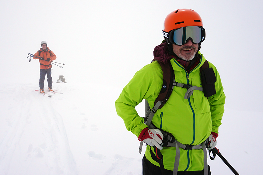 Our 4th day was pretty grim. Though we had some new snow (much appreciated) visibility was pretty dreadful all day long. Here, we are again trying our Day 1 plan, up Monte Rocca. |