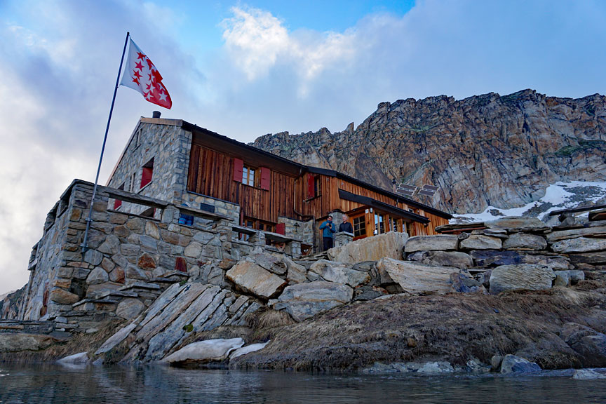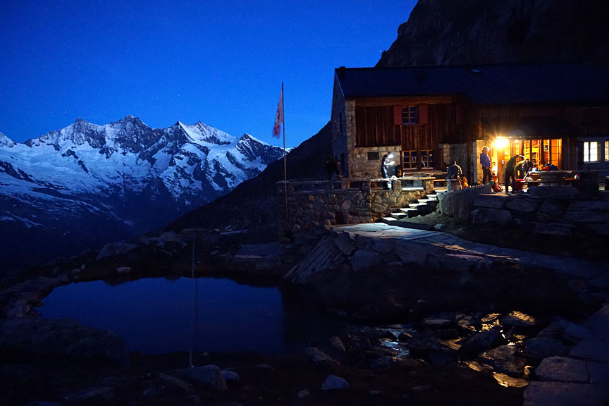 Above the hut, the first rays of the sun light up the Mischabel peaks. |