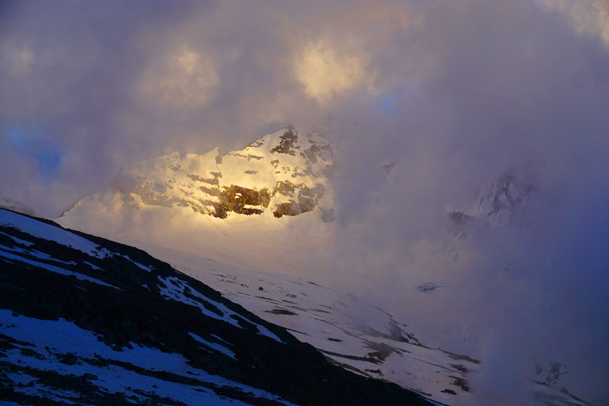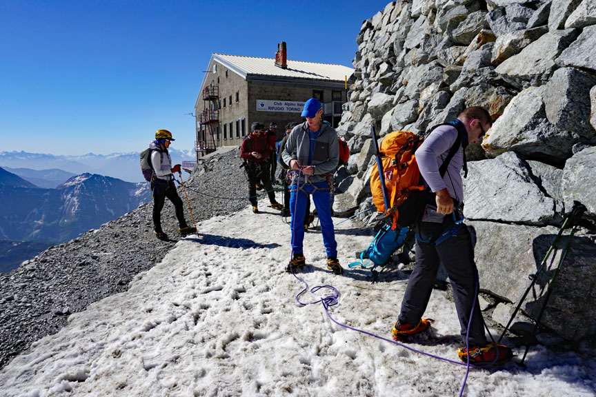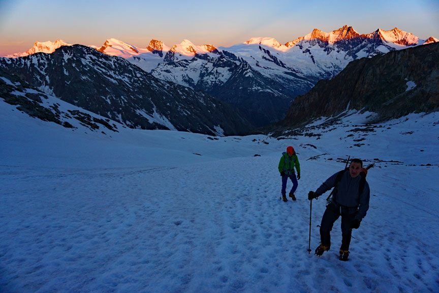 The following morning we prepare to leave the hut just as the twilight breaks. Our Goal, the South Ridge of the Weissmies. |