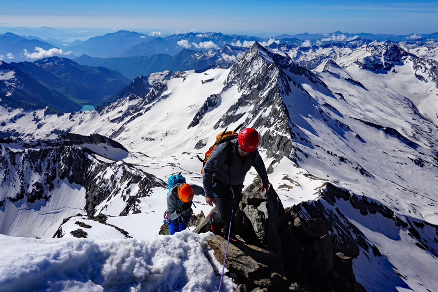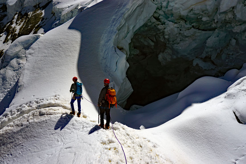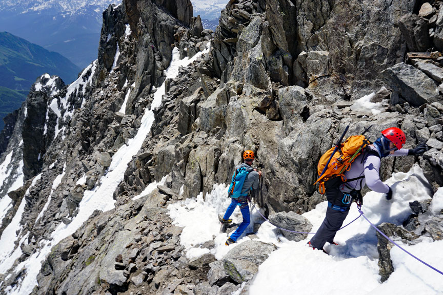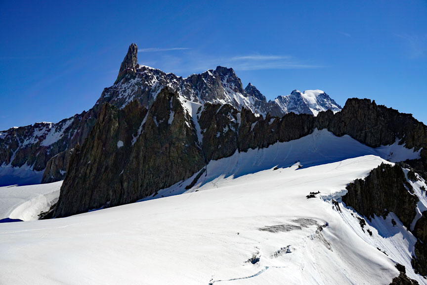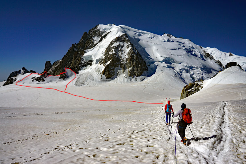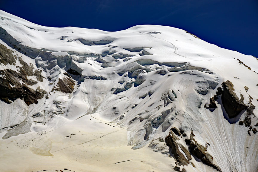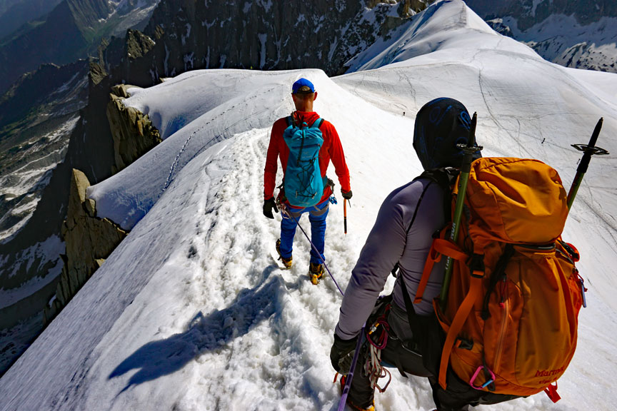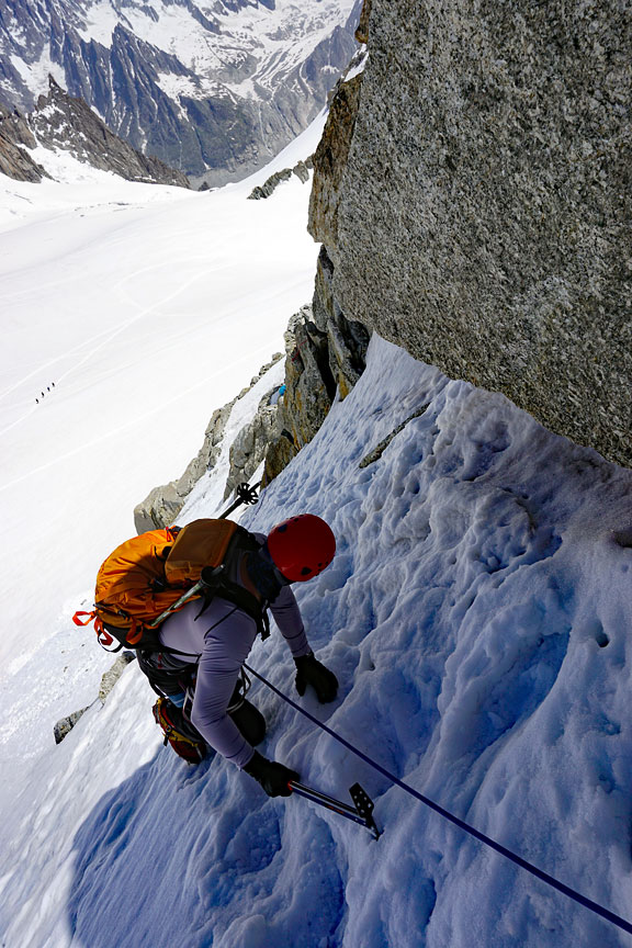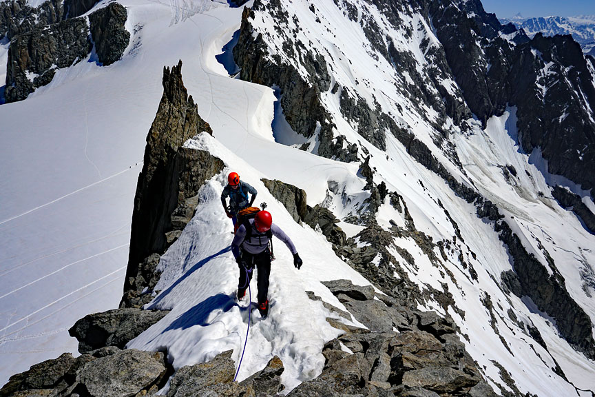 On our last day, we traverse the peaks of Points Lachenal. This day starts with a ride up the Aiguille du Midi cable car. From the top of the Midi we exit an ice tunnel, down the ridge and across the glacier to our objective. |