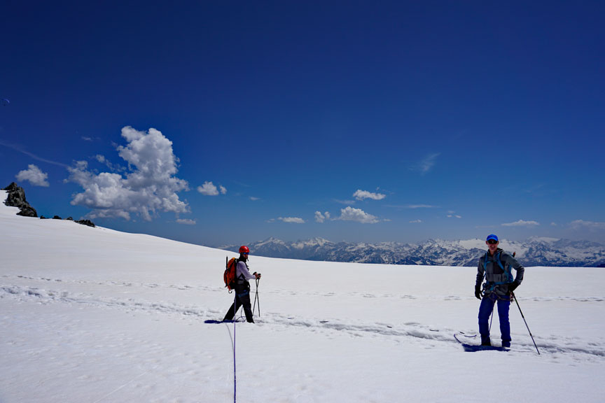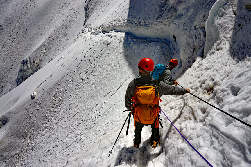 After a bunch more downclimbing, a rappel or two, we arrive back on the glacier. |