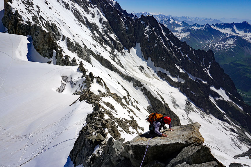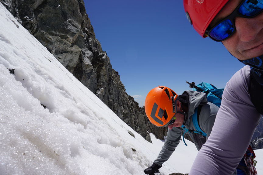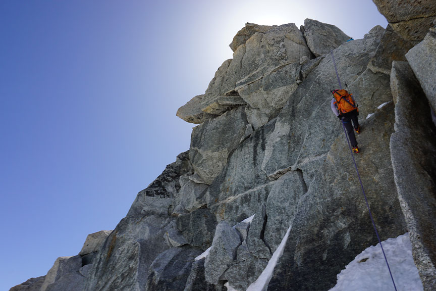 Climbing the pitch out from the notch of the Grand Gendarme. |