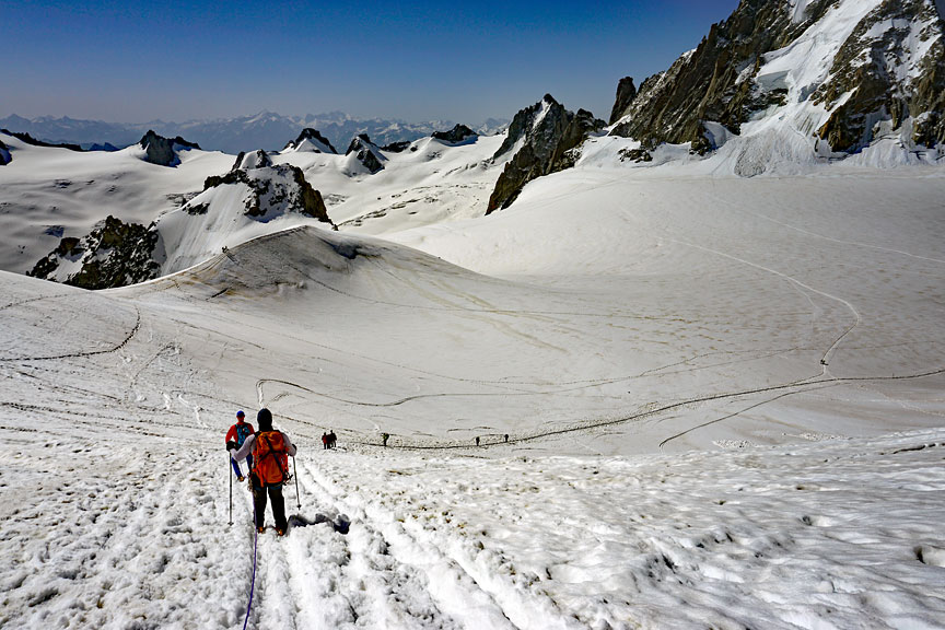 The next day, our 5th, we drove through the Mont Blanc Tunnel, up the Skyway lift and are roping up to wander over to the Aiguilles Marbrees. |