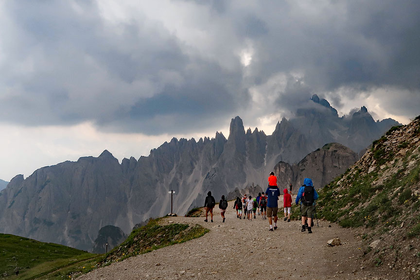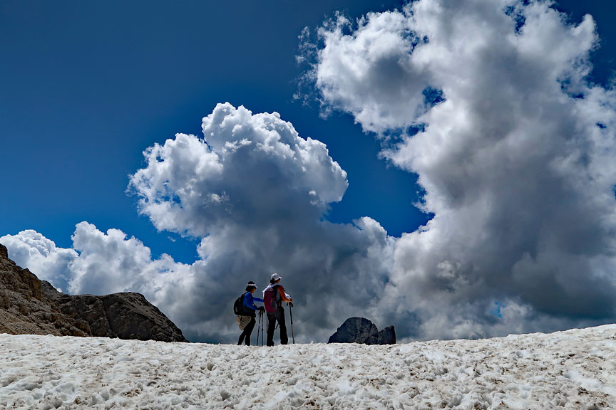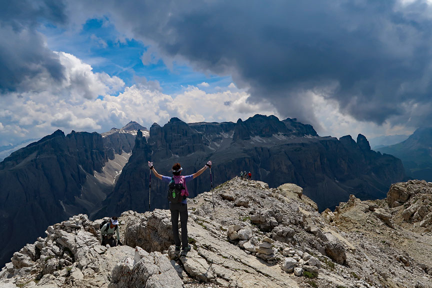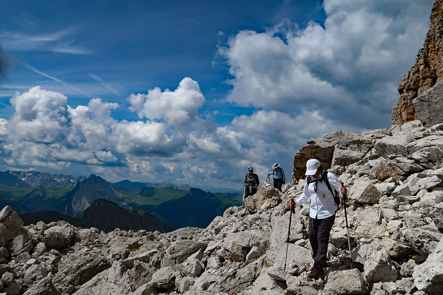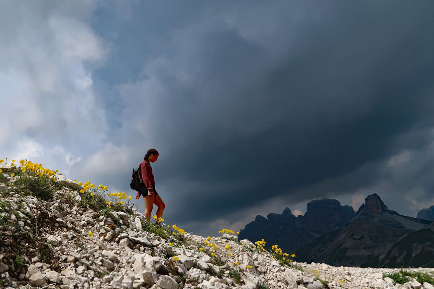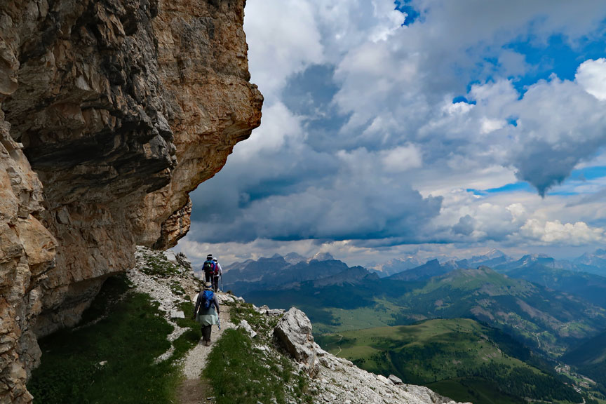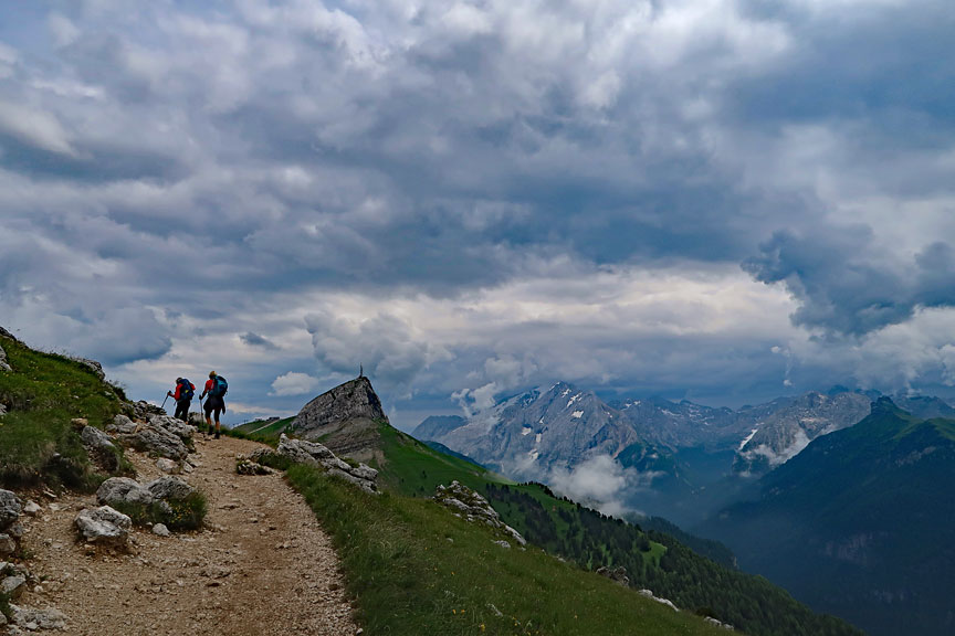 Day 3, we dodge building squalls en route to the Sella Pass. |