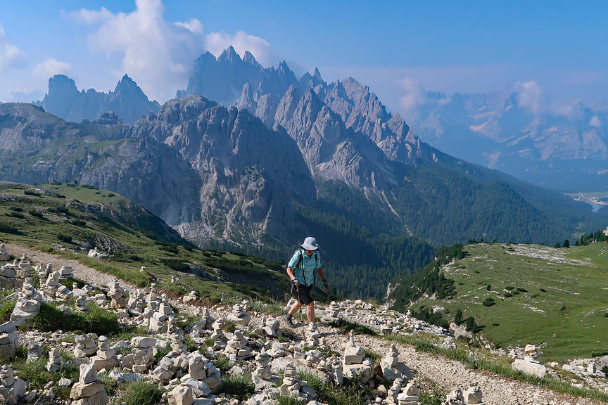 We ended up in the famous Tre Cime area. Frannie in the middle of a fanciful garden of "stonemen" built by past hikers. |