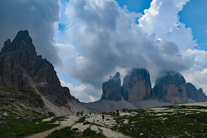 The famous Tre Cime disappearing under afternoon cumulus buildup. |