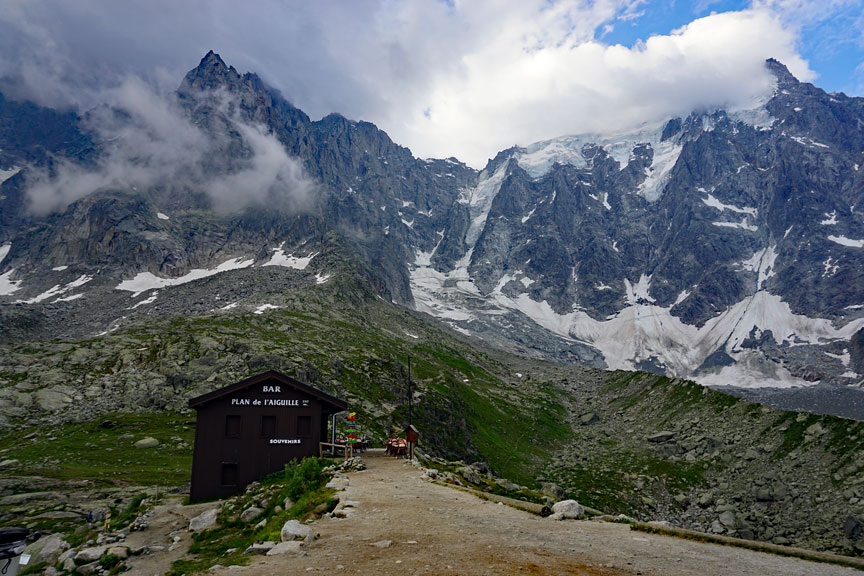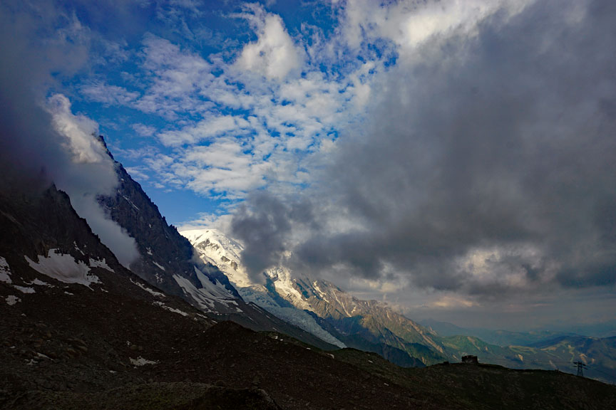 We had two more days of climbing from which I have no photos. But I did get a photo of the South Face of the Aiguille du Midi as we approached on our last day. Mouse over to see the line. |