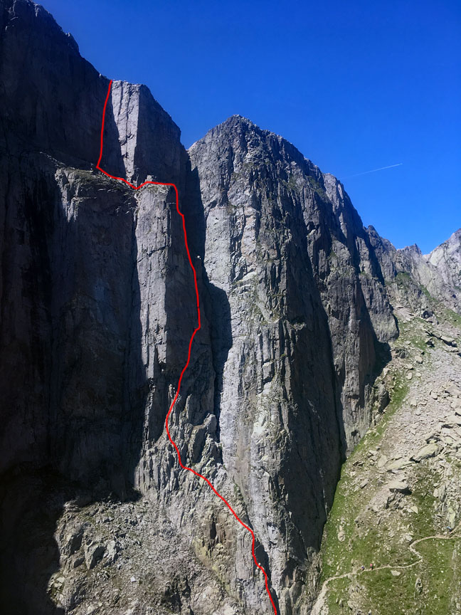 The view of the Lames. The route climbs some of the clean slabs in the sun |