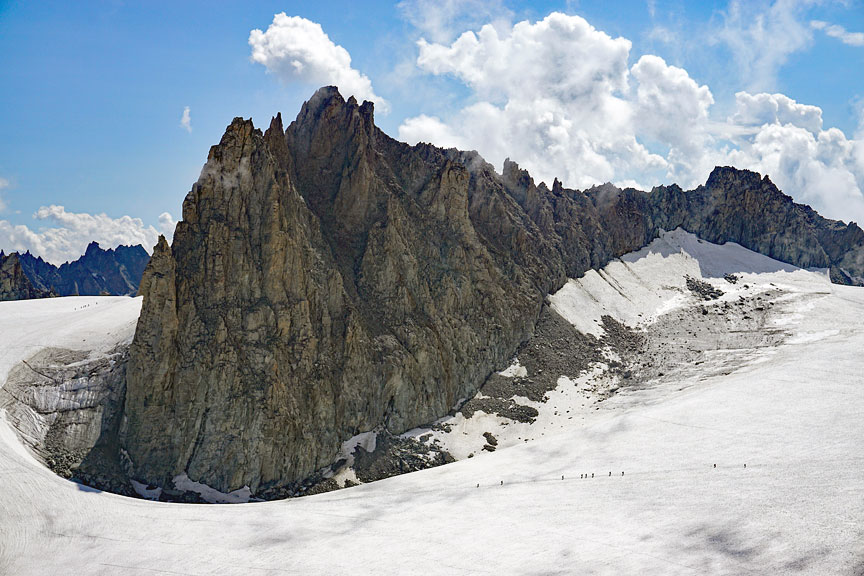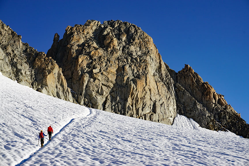 The following day, we were back in the same area, with a traverse of the Aiguilles Marbrées. The route ascends the peak from around the left side, then traverse the ridge seen here, to the right. The descent leads to the high point of snow on the right. |