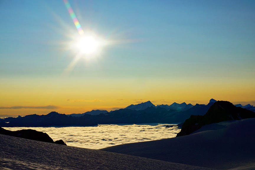 Looking east, not long after sunrise. The Weisshorn is the big peak just right of center. |