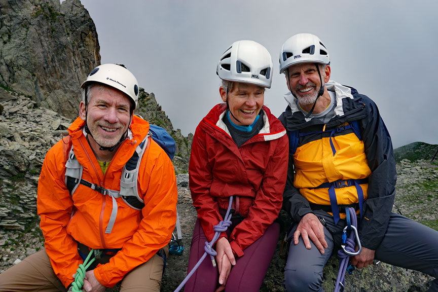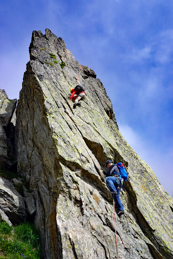 We started with a climb in the Aiguilles Rouges called Somone. This is the party ahead of us, on pitch 4 of 7. |