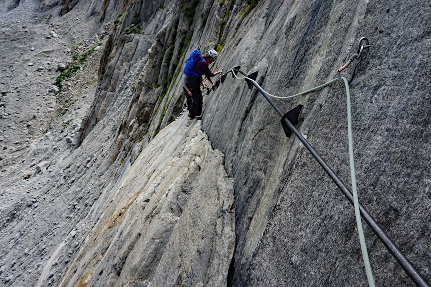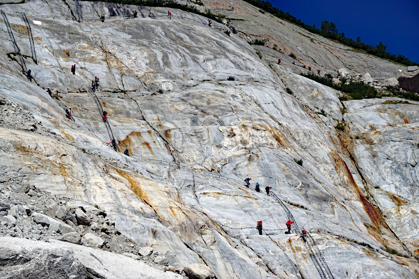 On day 2, we made the journey to the local ice climbing destination, the Mer de Glace. The approach involves a long series of ladders. Each passing year marks the addition of another few meters of ladder as the glacier retreats and thins. Incredibly enough, when Kathy and I first came to the Alps to climb, in 1980, not a single ladder in this image was needed to get to the glacier. |